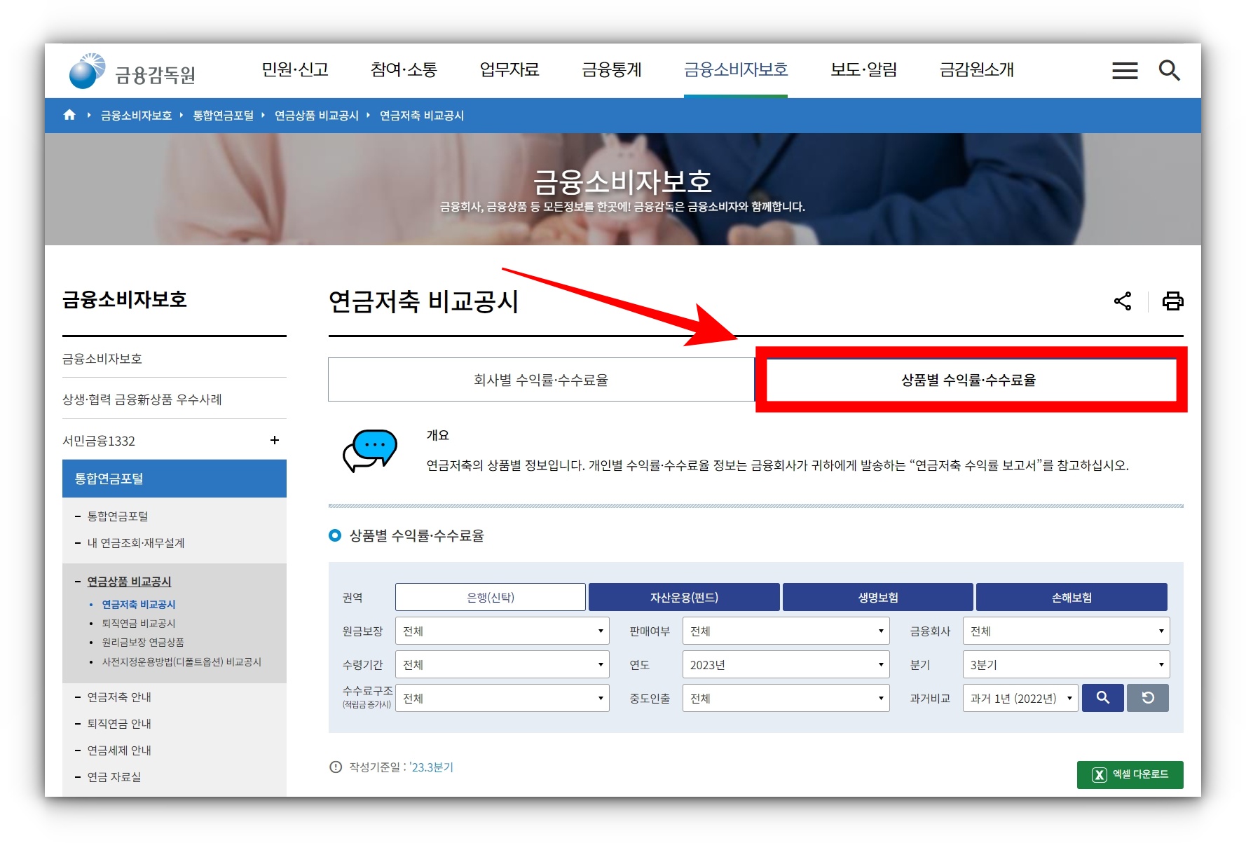 다음으로 "연금저축 비교공시" 화면이 나오는데, 여기서 상품별 수익률ㆍ수수료율을 선택합니다.