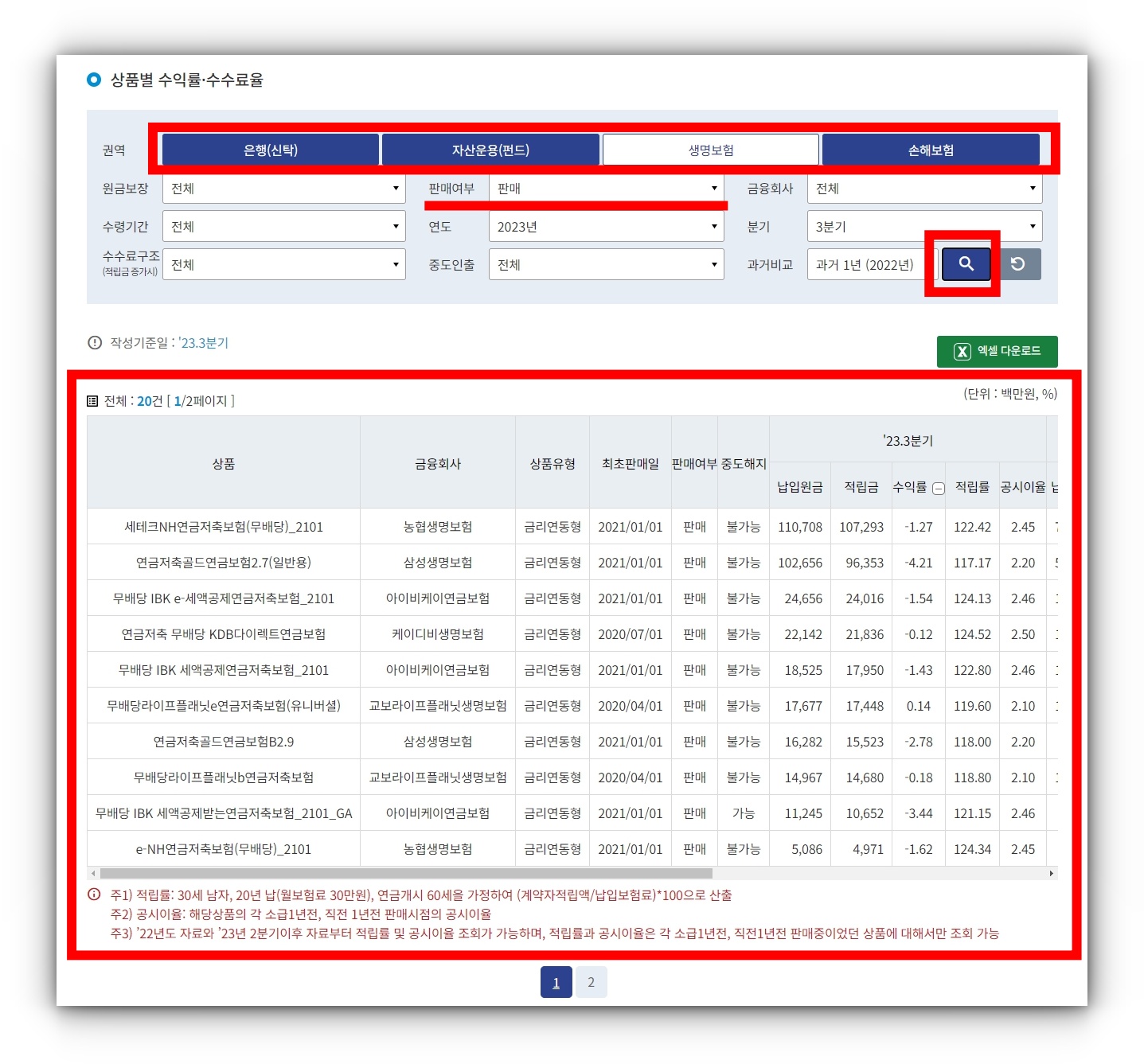 다음으로 은행과 자산운용(펀드), 생명보험, 손해보험 4가지 권역에서 선택하시면 되시고, 판매여부는 꼭 "판매"로 설정하셔야 현재 판매 중인 상품을 확인하실 수 있습니다.