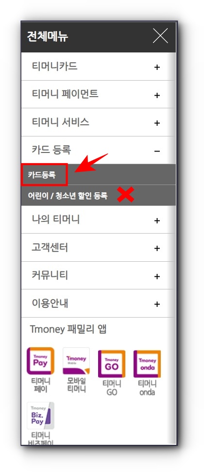 어린이 / 청소년 할인 등록이 아닌 "카드등록"을 먼저 진행해 주셔야 합니다.